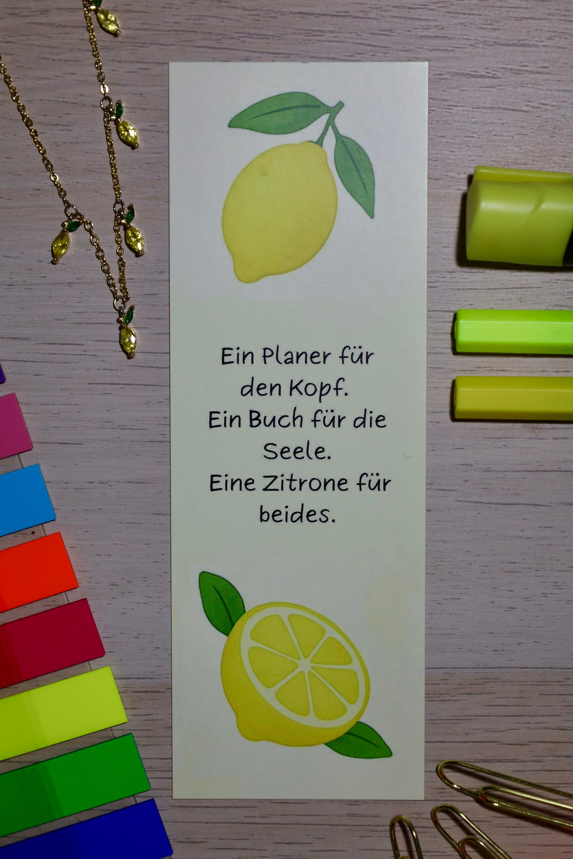 Jedes Design verbindet sanfte Worte mit einem Hauch Zitrone und erinnert dich daran, beim Lesen kurz innezuhalten, durchzuatmen und den Moment zu genießen. Ob in deinem Lieblingsbuch, deinem Journal oder etwas ganz Neuem, diese Lesezeichen begleiten dich durch jede Geschichte und machen jede deiner Pausen zwischen den Seiten ein bisschen schöner.